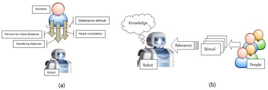 Ostensive-stimuli in people-to-robot interaction: (a) A robot and ostensive-stimuli of a single person; (b) relevance acquisition from observed ostensive-stimuli of multi-person with respect to robot’s equipped knowledge.