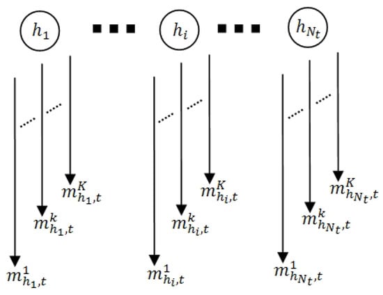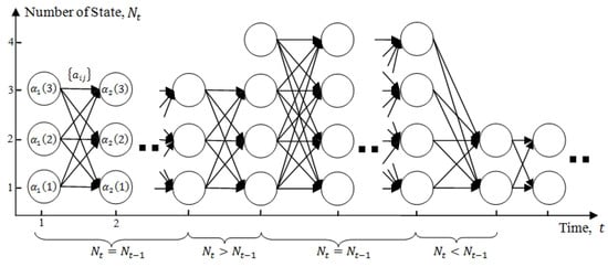 Figure 4 illustrates the induction procedure, showing how state can be reached at time t from the possible states at previous time . Prior to computation, the validation process (Step (2.1)) must be performed at each induction step. The process, which has computational complexity, validates the current number of states (the participants in a robot’s view). In the case of a decrease in the number of participants, an index re-correction of the participants may be required, such that computation failure can be avoided in run-time.