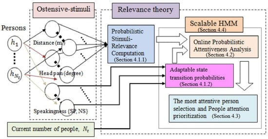 Let us define a group of participants as , where is the number of participants at time t and . Focusing on any person , are the observed ostensive-stimuli, which are scalar, independent, and bounded with their observation ranges. denotes an ostensive-stimuli vector of person at t, where K is the number of ostensive-stimuli and . Hence, becomes an ostensive-stimuli vector of a group of participants at t. Later, Section 4.1.1 describes probabilistic stimuli-relevance based on the relevance theory.