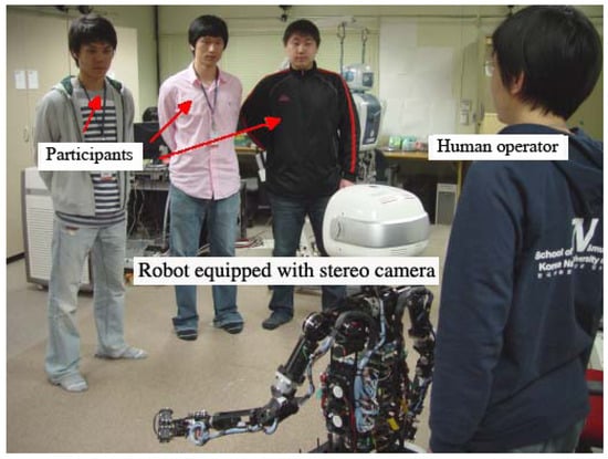 - Tasaki, T.; Matsumoto, S.; Ohba, H.; Toba, M.; Komatani, K.; Ogata, T.; Okuno, H.G. Dynamic communication of humanoid robot with multiple people based on interaction distance. In Proceedings of the 2nd International Workshop on Man-Machine Symbolic System, Kurashiki, Okayama, Japan, 20–22 September 2004. [Google Scholar]