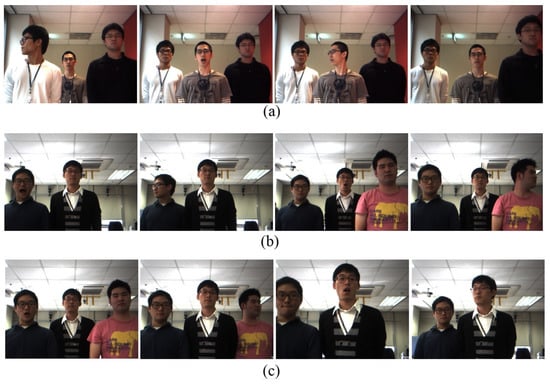 Figure 6 illustrates various situations with participants randomly performing actions (speaking, head turning, walking toward or away from a robot, and entering or leaving a robot’s view). The first row (Figure 6a) shows an image sequence of three participants randomly turning their heads, exhibiting speaking or non-speaking intervals, and walking towards or away from the robot. The second and the third rows (Figure 6b,c, respectively) illustrate the image sequences, showing an individual entering or leaving the robot’s view.