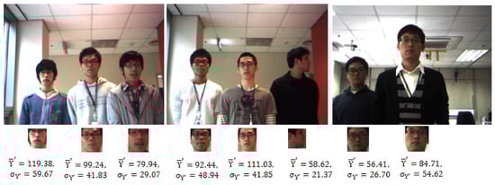 The illumination conditions were natural and not controlled in any of the collected image sequences. As a result, the face size and the lighting conditions for the persons in different locations in the robot’s view differed, as shown in Figure 7. The illumination can be calculated and represented by the luma component (Y′) in Y′UV color space which is the weighted sum of RGB components of a color image. In Figure 7, the brightness and its variation of a face image of each person is demonstrated by the mean of luma () and its standard deviation ().