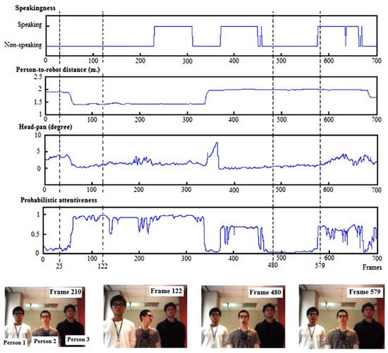 Most attention systems are generally composed of two distinctive sections: (1) feature extraction and (2) an attention model. (1) Feature extraction extracts attention-related visual features (ostensive-stimuli) from an image sequence and/or audio features from a sound stream. Various visual features are often chosen to be used as stimuli for the attention system such as the distance between a robot and a person [,], the head direction of the people participating in an interaction [,,,,,], and/or visual speaking status detection [,,,,,]. When audio features are used for the attention model, the direction of a sound source and the distance to a sound source are usually adopted [,,]. (2) The attention model evaluates the selected stimuli and computes the attentiveness of each person. Finally, the most attentive person, as well as the attention priority of the individuals, in terms of their attentiveness, are determined. Intuitively, a robot equipped with an attention system can be considered to be more flexible and effective in their interactions with humans compared to the robot without one.