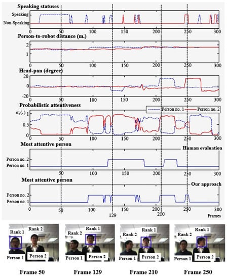 To evaluate the performance, the proposed method was tested with 10 image sequences consisting of a total of 7567 frames, displaying individuals who were speaking, walking, turning their head, and entering or leaving a robot’s view. None of the 10 image sequences were used during the training phase. The performance results were compared to the performance of a human and two widely used attention approaches: a set of event conditions [] and a heuristic algorithm [].