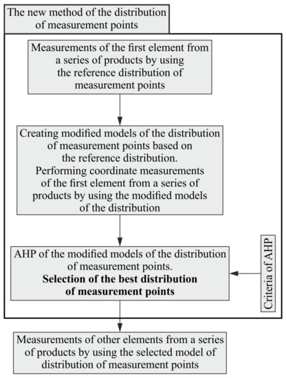 The article presents the new method for determining the location of measurement points on free-form surfaces of measured products. The results of the performed investigations and the analysis carried out by using the AHP method indicate the possibility of a significant reduction in time of coordinate measurements of a series of products when using the new method for determining the distribution of measurement points located on measured free-form surfaces. The time reduction is the result of decreasing the number of measurement points for most products that are the part of a given series of workpieces. Moreover, a smaller number of measurement points does not reduce the accuracy of coordinate measurements, which results from taking into account various criteria of the considered AHP analysis, e.g., ‘the time of coordinate measurements’ and ‘the form deviation of a measured surface’, when determining the location of measurement points by using the proposed method.