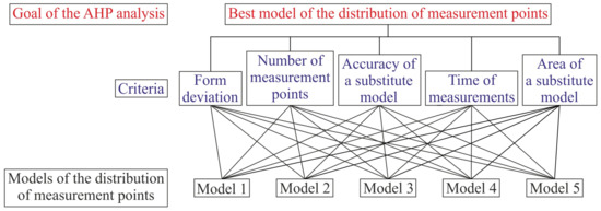 The goal of the AHP analysis was the selection of the best model of the distribution of measurement points lying on a free-form surface. To select the most appropriate distribution of measurement points the following criteria were used:
