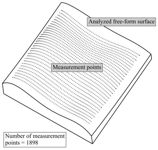 The investigations were carried out for the selected free-form surface shown in Figure 3. Its 3D model was created by using the CATIA V5-6 software and then imported into the Calypso metrology software of the Carl Zeiss company. In the Calypso software, the reference distribution of measurement points was declared. It includes the largest number of points, and thus it provides the highest probability of measuring the actual value of a form deviation of an analyzed curvilinear surface. The real object containing the analyzed free-form surface was made of aluminum alloy by using the DMU 100 monoBLOCK CNC machine tool. The dimensions of the bottom surface of the machined product were around mm. The considered free-form surface of the product was the theoretical surface that was used to present the possibilities of the proposed method for defining the distribution of measurement points. Therefore, no technical documentation, including, e.g., geometrical tolerances, was available for this investigated surface. The values of tolerances were not needed for the presentation of the proposed method. However, the documentation of the machined product is, of course, necessary, but after applying the developed method and selecting measurement points, when the accuracy of the product should be assessed.