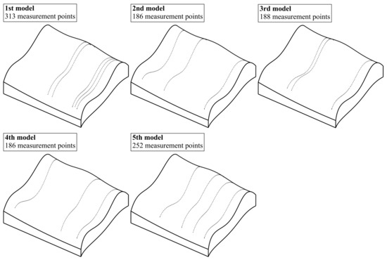 The best distribution of measurement points located on the selected free-form surface was chosen from the group of five different models of the distribution of measurement points. The models were randomly selected by an operator of a coordinate measuring machine. Figure 4 illustrates the considered models of the distribution. The models, similarly to the reference distribution of measurement points, were created by using the Calypso inspection software. The models were prepared by modifying the reference distribution of points presented in Figure 3. The modifications involved changing the amount of the scanning lines containing measurement points and distributed on the investigated free-form surface. The use of the models based on measurement points arranged along selected curves representing the analyzed curvilinear surface results from a scanning measuring probe applied during experimental research. However, the proposed method of determining the location of measurement points can also be used for other distributions of points (not only lying on selected curves) measured by using, e.g., the single-point probing mode.