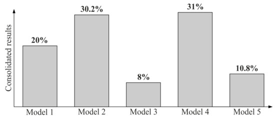 Table 12 presents the sequence of the alternatives (i.e., the considered models of the distribution of measurement points), based on the weights calculated with respect to each criterion, after performing the AHP analysis. Moreover, Figure 7 presents the consolidated weights of the alternatives that have been derived by taking the criteria and alternatives-based pairwise comparisons into consideration.