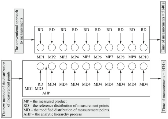 After conducting the AHP analysis, the rest of objects from analyzed series of products should be measured by means of a selected modified distribution of measurement points, as shown in the second part of Figure 1. The modified distribution includes a smaller number of points compared to the reference distribution. This, in turn, reduces the time of contact coordinate measurements of curvilinear surfaces of products. Speeding up a measurement task by using a smaller number of measurement points is mainly visible when measurements are carried out in the single-point probing mode. This mode of coordinate measurements is still widely used in the industrial practice, e.g., during measurements carried out with the use of coordinate measuring machines or CNC machine tools.