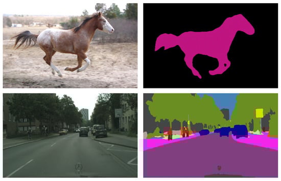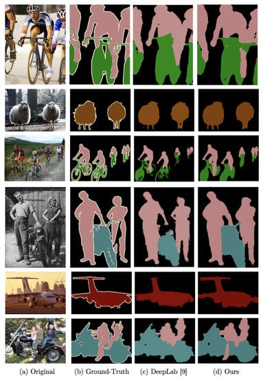 Pascal Visual Object Class (VOC) 2012 [41] is a dataset containing objects in different scenarios including people, animals, vehicles, and indoor objects. It contains three different types of challenges: classification, detection, and segmentation; the latter was utilized in this paper. For the segmentation benchmark, the dataset contains 1464 images for training, 1449 images for validation, and 1456 images for testing annotated for 21 classes. Data augmentation was used to increase the training set size to 10,582.