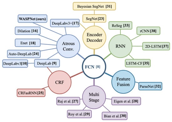 Semantic segmentation is an important computer vision task [1,2,3] with applications in autonomous driving [4], human–machine interaction [5], computational photography [6], and image search engines [7]. The significance of semantic segmentation, in both the development of novel architectures and its practical use, has motivated the development of several approaches that aim to improve the encouraging initial results of Fully Convolutional Networks (FCN) [8]. One important challenge to address is the decrease of the feature map size due to pooling, which requires unpooling to perform pixel-wise labeling of the image for segmentation.