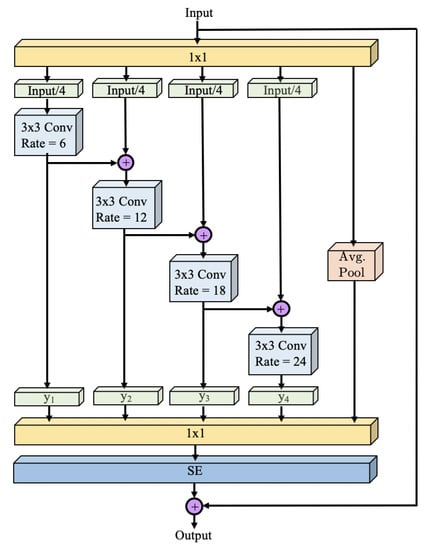 Res2Net [11] is a recently developed architecture designed to improve upon ResNet [15]. Res2Net incorporates multiscale features with a Squeeze-and-Excitation (SE) block [39] to obtain better representations and achieves promising results. The Res2Net module divides the original bottleneck block into four parallel streams, each containing 25% of the layers that are fed to 4 different 3 × 3 convolutions. Simultaneously, it incorporates the output of the parallel convolution. The SE block is an adaptable architecture that can recalibrate the responses in the feature map channel by modeling the interdependencies between channels. This allows improvements in performance by exploiting the dependencies between feature maps without increase in the network size.