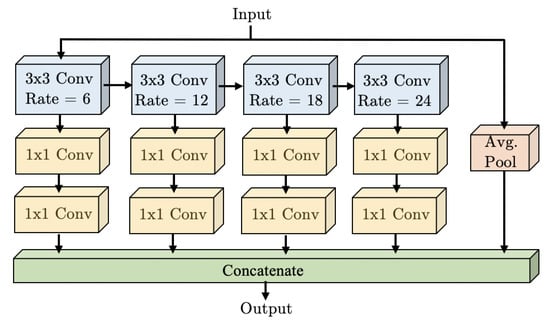 The name Atrous is derived from the French expression “algorithm à trous”, or translated to English “Algorithm with holes”. As alluded by its name, Atrous Convolutions alter the convolutional filters by the insertion of “holes”, or zero values in the filter, resulting in the increased size of the receptive field, resembling a hybrid of convolution and pooling layers. The use of Atrous Convolutions in the network is shown in Figure 3.