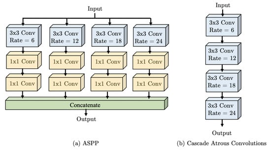 A comparison between the ASPP module, cascade configuration, and the proposed WASP module is visually highlighted in Figure 6 and Figure 7, for the ASPP and cascade modules. The WASP configuration consists of four branches of a Large-FOV being fed forward in a waterfall-like fashion. In contrast, the ASPP module uses parallel branches that use more parameter and are less efficient, while the cascade architecture uses sequential filtering operations lacking the larger FOV.