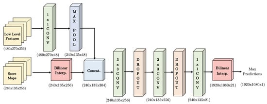Figure 8 shows the decoder and the respective stage dimensions and number of layers. The representation considers an input image with dimensions of 1920 × 1080 × 3 for width, height, and RGB color, respectively. In this case, the decoder receives 256 maps of dimensions 240 × 135 and 256 low level features of dimension 480 × 270. After matching the dimensions for inputs of the decoder, the layers are concatenated and processed through convolutional layers, dropout, and a final bilinear interpolation to reach the original input size.