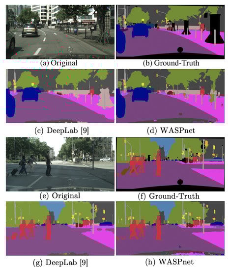 Figure 10 shows examples of Cityscapes image segmentations with the WASPnet method. Like our observations from the Pascal VOC dataset, our method produces better defined shapes for the segmentation compared to DeepLab. Our results are closer to the ground-truth data, and show better segmentation of smaller objects that are further away from the camera.