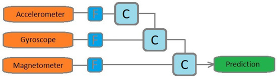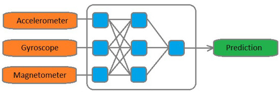 The solution for the problem can be a neural network which learns how to estimate the robot position according to the sensor data. Existing methods [15,16] approached mainly the orientation estimation task with an explicit model like the schematic illustration in Figure 2. The data of each sensor is filtered separately and after the filtering step, the sensor data are combined according to a predefined order.