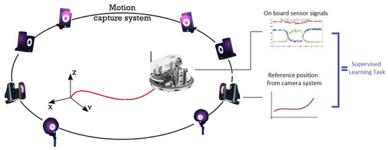 A synchronised measurement system can log the position of the robot in an absolute coordinate system and the data from the onboard MARG sensor at the same time. Detailed information about the measurement system will be provided in Section 4.4. The external camera system provides the 3 axis position and the orientation of the robot in quaternion form. The onboard MARG sensor provides three-axis acceleration, gyroscope and magnetometer data. The data from the external camera system is used only during the learning phase as reference. After the algorithm learns how to predict the position according to the pattern in the data of the sensor, in the prediction state only the data of the sensor is needed. The implementation on an autonomous mobile robot can be executed according to the following Algorithm 1.