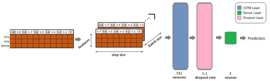 As a base line solution a simple long short-term memory network was built according to Figure 5. LSTM networks are the best option to fit time series data. The three input parameters are the two sine functions ( and ) and the sampling time (). The desired output functions can be or . We used an eight-measurement wide window to take into consideration the previous time steps and set the epoch size to 50. The hyperparameters did not change during the whole study. In this case, we can make a comparison of the layers efficiency in different cases and focus on the effect of the noise. Tests were made using different noise levels. The results are explained in Section 4.2.