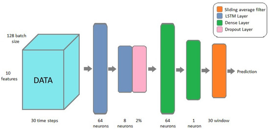 In the second step to improve the performance of the application a deeper neural network was built. The extended neural network architecture is illustrated in Figure 6. The implemented network contains two LSTM layers with 64 and eight neurons, two dense layers with 64 neurons and one neuron, and a sliding average filter is applied at the end of the neural network to make the prediction smoother. The LSTM layers modelled the time series data and the dense layers made the final prediction. To prevent the network from getting stuck in local optimum point a dropout layer is added to the architecture. The result of the extended network on simulated data are explained in details in Section 4.2.