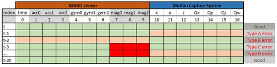 The position and orientation from the motion capture laboratory serves as a reference, or desired output for a learning task, whilst the sensor data serves as input data for a neural network. The output of the applied neural networks is only one variable in every case. The effect can be examined separately and after the test case, the different output specialized networks can be merged or run in parallel. In these measurements, an additional error type is occurred due to the different sampling frequencies of the different sensors and motion capture laboratory. This error case, shown in Figure 7, is not covered by the simulation environment. In best-case scenario, the MARG sensor data and the motion capture data are synchronized. In some cases, the data are not in align like in the case of type A or type B errors. This can happen when the measurement system sampling time is smaller than the sampling time of the two included systems. These cases can be handled by keeping the data of the motion capture system as long as a new measurement is taken. We wanted to keep every piece of useful information from the MARG sensor and avoiding interpolation for the missing data. Interpolating the missing data would cause the neural network to learn an unwanted calculation inside the data pool. The timing of the MARG sensor is forced in such a way that type B errors do not occur anymore. Type A errors can occur if the motion capture system loses track of the markers, but this case was not present during the measurement. Type C error is the most common error type. Since the magnetometer sensor sampling frequency is less than the sampling frequency of the accelerometer and the gyroscope. Handling type C errors is left to the neural networks. Depending on the measurement setup sampling time option the ratio of the appearance of type C errors can change. Looking at the whole process of learning it is easier to handle this error type inside the neural network. Type D error is a combined case of type A and type C errors, but with the previous ideas, it can be reduced to type C errors.