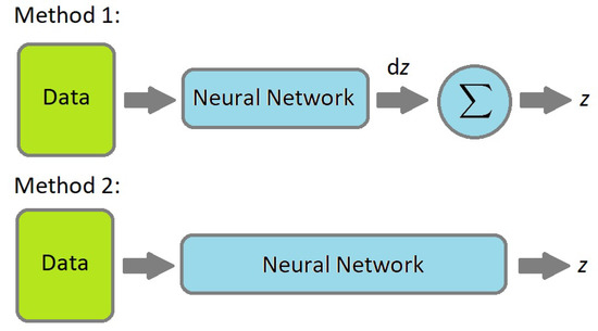After the error handling a signal preprocessing step was performed. At every time step, a differential position (dx, dy, dz) and time () are calculated by extracting the new measurement data from the previous step. Neural networks may work better on differential data, because the range is predictable. Thus, two methods are investigated as shown in Figure 8. The application has predictable limits and ranging the data are part of the preprocessing stage as data normalization, also known as feature scaling.