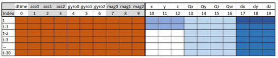 Absolute time stamps () from the measurement has to be converted into a ranged signal (). This step can be implemented in the final application as well. The full data frame can be seen in Figure 9. The orange cells serve as the input information to the neural network, while the blue cells are the optional desired outputs of the neural network.