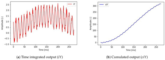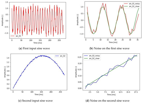 In the simulation environment a 300 samples wide time window was generated. The sampling time (T) was set to a constant value. Additional random noise with Gaussian distribution can modify the sampling time according to Equation (6) to determine the noise affected sampling time (). Using the same noise affected sampling time vector 2 sine functions were generated according to Equations (7) and (8) as input functions. As a desired output, two possible signals were generated using the input signals according to Equations (9) and (10). With the help of these signals the effect of time multiplication and numerical integration can be examined. These type of calculations are likely to be required in a real life scenario.