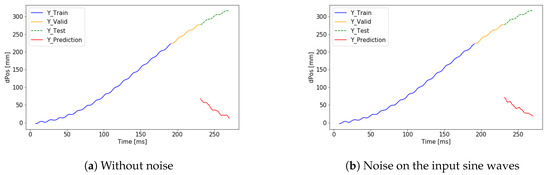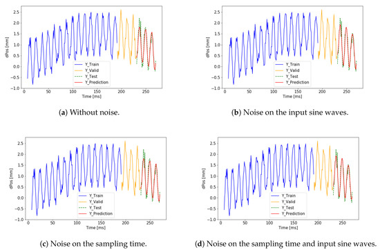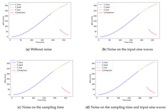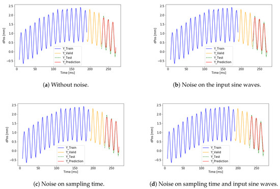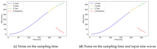 The simulation environment introduced in Section 4.1 was used to examine different test cases. We focus on the effect of the noise in different learning setups. In the first block, , was used as the desired output. The test cases include 3 types of noise. Noise on the sampling time, noise on the amplitude of input sine waves, and noise on the desired output. In every case, the noise was a random noise with Gaussian distribution without offset. The maximum noise level was 5% of the amplitude of the input sine waves. The parameters and the calculated validation loss values are summarized in Table 1. The training data and the visualization of the predicted output can be seen in Figure 13 and Figure 14, where the training data is marked by blue, the validation data set is marked by yellow and the test data set is marked by green, and the prediction is marked by red. The training and validation data sets were used by the algorithm to set the weights and hyperparameters. The test data set was only used to measure the success of the training of the neural network. If the predicted signal (red) overlaps with the reference signal (green) the result of the training is successful. The simulated and the predicted curves are almost identical at the end of the graph and a trend matching can be observed by the different coloring.