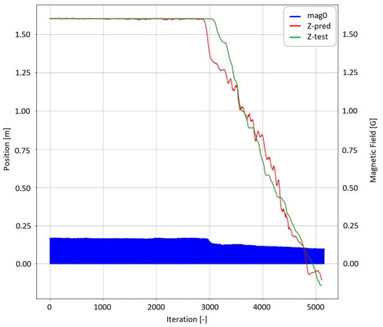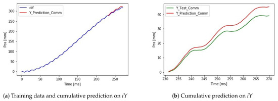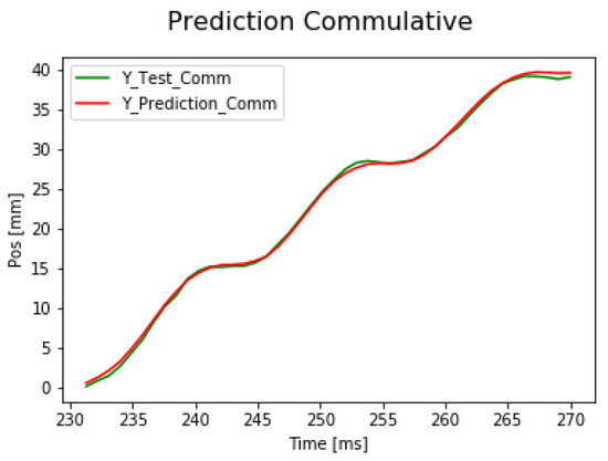 First, the signal is predicted by the neural network. After summing the predicted small differences, the signal can be calculated. The cumulated error is presented but the validation loss is 14.144 mm, which is significantly smaller than in the case of predicting the absolute position directly. The results can be seen in Figure 17. The performance of the application is improved using a deeper neural network architecture. Using the extended network the validation loss dropped to 2.46 mm. The result of the extended network can be seen in Figure 18.