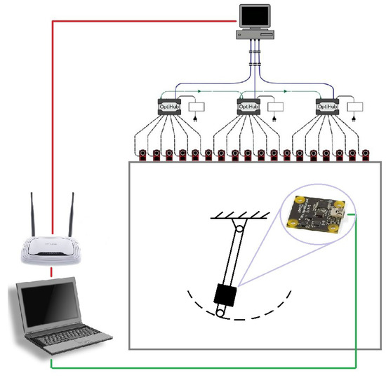 The motion capture system update frequency is 120 frames per second (FPS). All of the data was logged on a Lenovo Y520 laptop with an NVIDIA GeForce GTX 1050 graphic card. The laptop collected synchronized data from the sensor and the motion capture system. The schematic drawing of the measurement system can be seen in Figure 19.