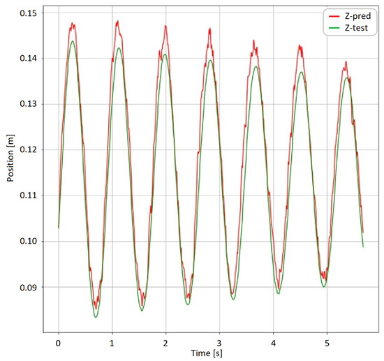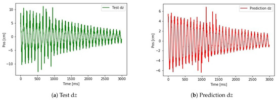 In the first approximation, the network was tested on the dz position values. The training and validation data and the test data are two independent measurements. This prevents any data leak, the algorithm has no information about the test data in the training phase. The reference signals and the predicted signals can be seen in Figure 21.