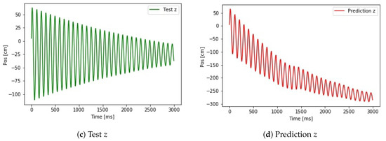 As a final result of the test of this study the proposed neural network-based approach provides a solution for predicting position from a data of a MARG sensor. Using neural networks on noisy sensor data can reduce the noise, and also can find the hidden structure in the noise. Extracting the information from the changes in the noise structure can improve the prediction ability of an algorithm. The tendency of the prediction shows that the harmful shifting effect of noise integration can be eliminated. Comparing Figure 21d to Figure 23 there is no shift in the prediction. The cumulated error can be reduced by the algorithm using the past position data during the learning phase and the previous prediction data during the test prediction phase.
