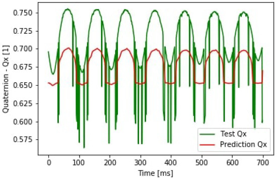 Examining the orientation output the result of predicting the component of the quaternion vector can be seen in Figure 22. In the figure, an offset prediction is shown. It shows that the reference data from the motion capture system needs additional filtering. This error came from the system itself and causes an offset in the prediction. Compared to the simulation the noise level was much higher during the real test case.