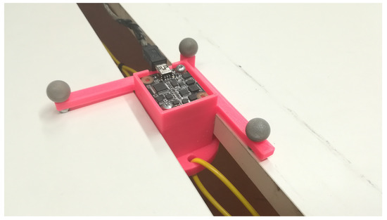 The previously tested and extended neural network model described in Section 3 and shown in Figure 6 was used on a real-life application. The use case is to mount the MARG sensor on a pendulum. The mounted sensor can be seen in Figure 20. The motion capture system can track the three marker as a solid body and provide the position and orientation data for the sensor. During the measurement, the synchronised time, the nine sensor values from the sensor, and the three-position data and four-orientation data in quaternion form from the motion capture system were logged.