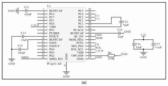 Figure 4a shows that in the peripheral circuit diagram of the Pcap01 chip, only a small number of peripheral devices were needed, of which PC0 and PC1 were connected to the reference capacitor Cref and PC2 and PC3 to the IDE being tested. The chip communicated with the data processing module, i.e., the microcontroller, through SPI bus.