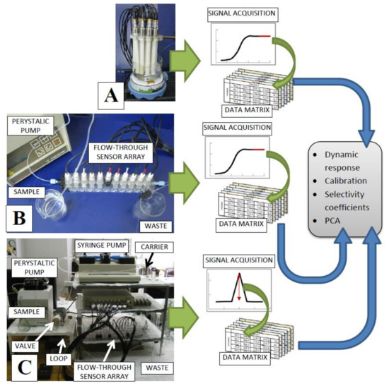 Three developed architectures of electronic tongues: (A) Classical set-up, (B) flow-through set-up, (C) FIA set-up. Reprinted from [60] Copyright 2015, with permission from Elsevier.