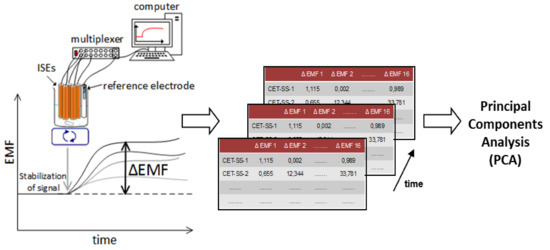 Conventional dissolution tests of pharmaceutical oral dosage forms performed by recommended apparatus are described in details in Pharmacopeias [68], since various factors such as temperature, pH, medium composition, ionic strength, and hydrodynamics affect this process. On the other hand, studies on pharmaceutical formulations carried out using various electronic tongues described in the literature significantly differ in terms of experimental conditions, although the same factors influence the obtained results. The qualification of electronic tongue systems was performed, but concerned only commercially available devices [69]. One of many factors determining the measurement conditions, which may affect electronic tongues results, has been considered (i.e., the effect of temperature on the αAstree system results was described on the basis of the studies of model solutions and food samples) [70]. Nevertheless, the standardization of the analysis performed by multisensory taste sensing systems is very desirable and should provide detailed protocols of measurements. Therefore, we examined various experimental factors, such as temperature, pH, and composition of the medium, in order to determine their influence on electronic tongue dissolution studies of pharmaceutical formulations. Moreover, the performance of the electronic tongues working in various hydrodynamic conditions was compared testing two systems with different architecture of the sensor array (but similar composition of the ion-selective membranes used in the electrodes) [71]. Minitablets containing valsartan were used as model pharmaceutical samples. A measurement procedure dedicated to dissolution studies of pharmaceutical formulations was developed and applied to all our further studies. The investigated pharmaceutical sample was introduced to the medium after stabilization of the sensors responses, then dissolution/releasing of the API and excipients caused changes of the signals in time–ΔEMF. Subsequently, those changes were processed using pattern recognition techniques; especially PCA was often applied due to the possibility of visualization of obtained chemical images of the samples and their changes over time (Figure 2).