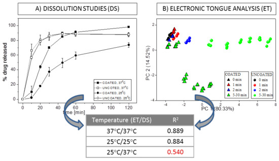 (A) Dissolution profiles of valsartan minitablets, (B) PCA plot during the release process carried out at 37 °C, and correlation coefficients calculated between the amount of API released during classical dissolution studies conducted at various temperature and distance in PC1–PC2 space. Adapted from [71].