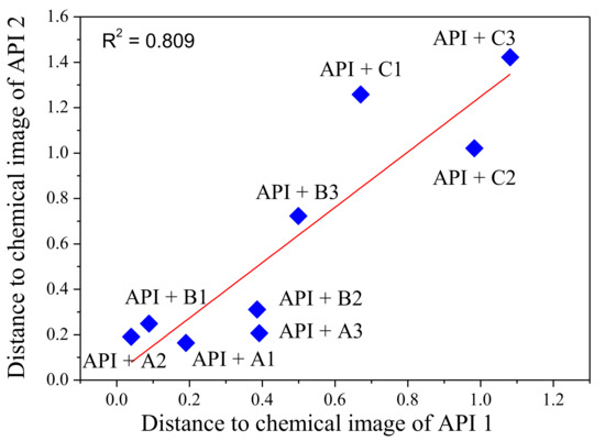 Comparison of relative distances in PC1–PC2 space: Calculated distances for metamizole sodium (API 1) and pseudoephedrine sulphate (API 2) mixtures with three different excipients (EXP-A,-B,-C) at various drug-to-polymer ratios (1,2,3). Reprinted from [74] Copyright 2017, with permission from Elsevier.