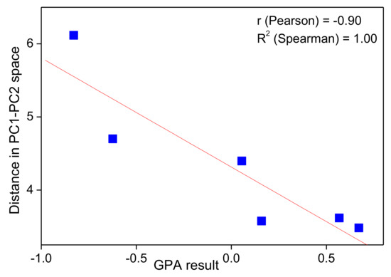 Correlation between Euclidean distance of chemical images of investigated formulations to API on PCA plot and human taste panel results (GPA scores). Reprinted from [72] Copyright 2017, with permission from Elsevier.
