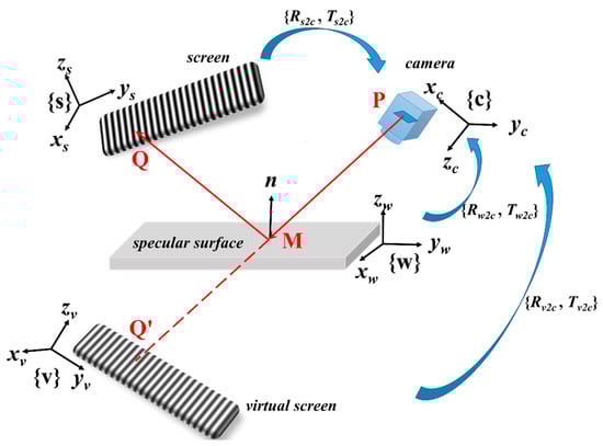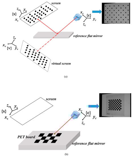 In the PMD-based 3D measurement systems, the calculated surface slope and the integration step are highly sensitive to the system error, which is caused by the calibration accuracy [16,17]. Therefore, the calibration method of the PMD system is very important, which determines the system measurement precision directly. Mostly, the PMD system calibration performs by calibrating the camera and system geometric parameters respectively. The camera calibration is conducted to compute the term camera calibration parameters [18,19,20]. The system geometry calibration refers to determining the relation between the screen, the reference mirror, and the camera. In detail, this step aims to find correspondence between screen pixels, the mirror reflected points, and the camera pixels. Since the screen that used to display the strip patterns does not lie within the field view of the camera in the PMD systems, it is difficult to obtain geometrical relation between the camera and screen without auxiliary setup.
