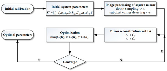 With the above operation and calculation, the initial camera and system geometrical parameters can be obtained. However, subject to the camera defocus, feature detection errors, manufacturing error of the transparent checkboard pattern and operating errors, etc., the initial calibration results of the PMD system are usually inaccurate. The following section will show how it can be optimized with a simple planar mirror.