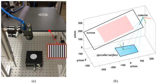 To verify the performance of the proposed calibration method, a PMD system is established as shown in Figure 5a. Dimension and relative positions of the setup is as shown by Figure 5b. The system consists of an LCD screen (HP 24 es 23.8-inch), which has a resolution of 1920 × 1080 and the pixel pitch is 0.2745 mm, an industrial camera (PointGray FL3-U3-32S2C-CS), which has a resolution of 2080 × 1552 pixel and the pixel size is 2.5 μm. The camera lens has a focal length of 12 mm. Distance from the object to the camera is about 360 mm. A sinusoidal phase-shifting pattern is adopted for the surface slope calculation as shown in Figure 5a. Virtual images of the displayed fringe patterns can be reflected by the mirror and then captured by the camera.