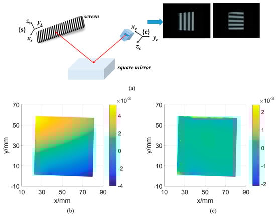 In the primary calibration step, the asymmetric dots pattern is displayed by the screen. By changing the posture of the reference flat mirror, 10 different views of patterns are acquired for camera calibration. While the last image was captured, without changing the position of the mirror, a transparent PET calibration board is attached on the mirror surface and captured by the camera. Following the method described in Section 2, the initial calibration parameters can be calculated. In the system parameter optimization step, a square mirror with a size of 60 × 60 mm is used as shown in Figure 6. Four corners of the mirror are detected from the image firstly. Then, with the primary calibration results, the mirror surface can be reconstructed to get its 3D model. Based on the reconstructed dense 3D points, a uniform down-sampling is applied to reduce the point number. Finally, three metric errors can be calculated. By solving Equation (15), the optimized system parameters can be calculated. Table 2 shows the parameters before and after optimization, namely K0 and respectively. The reference mirror is placed in the system as shown by Figure 6a. Measurement results of the reference mirror plane before and after optimization are shown in Figure 6b and Figure 6c respectively. And the three metric errors computed with two groups of calibration parameters are given by Table 3. We can see that the planarity by the optimized calibration parameters can be improved almost 10 times. The distance and angular errors also can be improved greatly after the optimization of system calibration parameters.