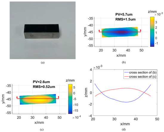 In the first experiment, a stainless gauge block with a polished surface is used for evaluation, which has a size of 26 × 6 × 10 mm as shown in Figure 7a. The block surface is reconstructed twice based on the same structured light images with initial parameters and optimal parameters. So, the difference between the two measurement results can only be caused by the calibration error. 3D reconstruction results by the conventional and proposed method are as shown in Figure 7b and Figure 7c respectively. By fitting the reconstructed 3D points with an ideal plane, the peak and valley (PV) and root mean square (RMS) values are calculated as {5.7, 1.5} μm and {2.6, 0.52} μm respectively. To indicate the change of surface shape more clearly, a section line is selected and plotted as shown in Figure 7d, the blue and red lines are the profile of Figure 7b and Figure 7c, respectively. With the above comparison results, we can see that measurement results by the optimal system calibration parameters can be improved distinctly.