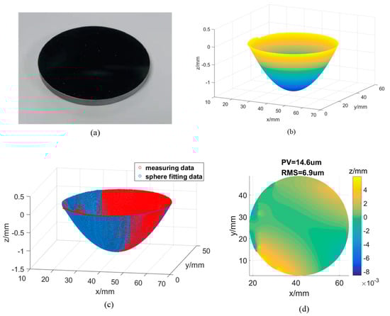 A concave aluminized glass is also used for the experiment as shown in Figure 8a. According to the specification provided by the manufacturer, its nominal aperture is 50 mm, and the radius of curvature of the concave mirror is 200 mm, with a tolerance of ±2%. Using the optimal calibration results, the reconstructed 3D model of the concave surface is as shown in Figure 8b. To visualize the 3D shape of the model, z axis is zoomed in. By fitting the reconstruction results with an ideal sphere as shown in Figure 8c, radius of reconstructed 3D model is about 199.12 mm, which locates within the metric tolerance. The PV and RMS error are calculated as 14.6 μm and 6.9 μm, respectively as shown in Figure 8d. In comparison, with the primary calibration results, the radius is calculated as 197.73 mm, the PV and RMS errors are 19.68 μm and 12.04 μm. Measurement accuracy improvement by the optimized system calibration results can be fully demonstrated.