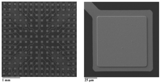 The final pMEA had PDMS as a substrate and 254 Au electrodes with dimensions of 100 µm × 100 µm. The distance between the centers of the electrodes was 300 µm with a 3.5 µm thick parylene C insulation layer. An SEM picture of the fabricated planar electrode is shown in Figure 3.