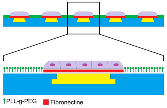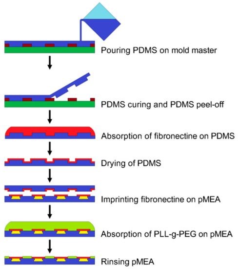 A drop of 50 μg/m: fibronectin in 10 mM phosphate buffered saline (PBS) with a pH of 8.5 was added to the PDMS stamp surface. The fibronectin was adsorbed onto the PDMS stamp surface for 1 h, and then, the PDMS stamp was rinsed in DI water and gently dried with N2 gas. The pMEA surface was treated with oxygen plasma at O2 = 50 sccm with a power of 40 W for 20 s to enhance the PLL-g-PEG coating. The PDMS stamp was aligned according to the pMEA electrodes with an optical prism and put into contact with the pMEA surface for 60 s. The PLL (20)-g-[3,5]-PEG (2) powder (SurfaceSolutions, Dübendorf, Switzerland) was dissolved in a 10 mM HEPES buffer with a pH of 7.4. The PLL-g-PEG solution was prepared in a concentration of 0.1 mg/mL. The pMEA with patterned fibronectin was coated by with PLL-g-PEG solution for 30 min. The PLL-g-PEG solution was removed, and the pMEA was rinsed twice by PBS (Ca2+ free and Mg2+ free). The fabrication of the PDMS stamp, the microprinting of the fibronectin, and the coating of the pMEA surface by antifouling PLL-g-PEG is shown in Figure 4.